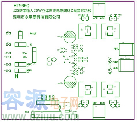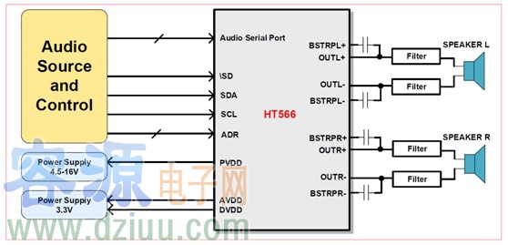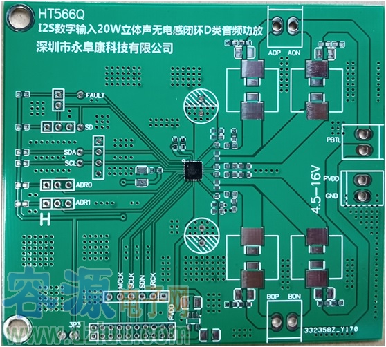深圳市永阜康科技有限公司現在推廣一顆I2S數字輸入20W立體聲無電感閉環D類音頻功放芯片HT566,適合應用于藍牙音箱、WiFi音箱、智能音箱、公交車語音播報系統等領域。該芯片支持I2S等多種數字信號輸入;電源:4.5V~16V;HT566支持極寬采樣率:8、16、32、44.1、48、88.2、96、192kHz;支持硬件默認工作模式以及I2C控制模式,并且I2C器件片選地址4個可選,非常靈活;所有的功能都可以通過I2C配置,包含數字信號格式選擇、左右聲道音量獨立調節、可將功放輸出配置成PBTL單聲道輸出、數字限幅的閾值設置、左右聲道獨立MUTE以及左右聲道信號交換等等。