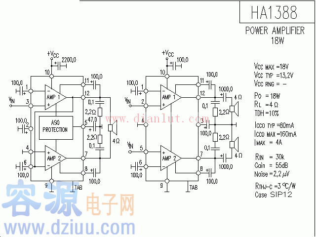 HA1388是音頻功率放大集成電路,應(yīng)用電路,采用12腳單列直插塑料封裝結(jié)構(gòu)。具有很多優(yōu)點(diǎn),該電路在電源電壓13.2V、 4負(fù)載阻抗和10%失真時(shí),輸出功率為l8W。 :