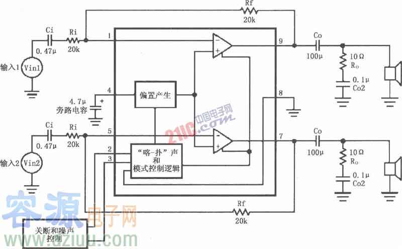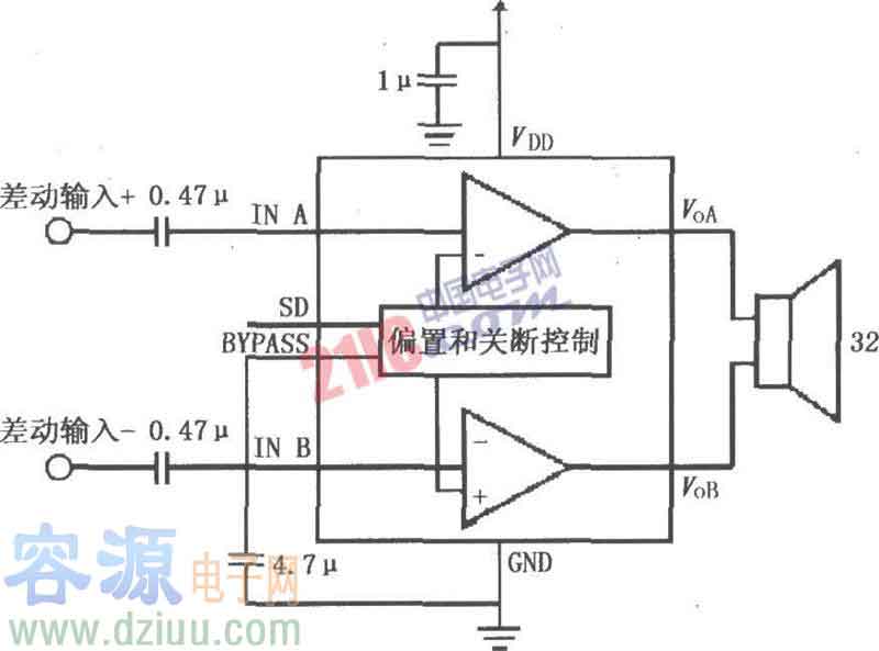 信號分別輸入LM4911(MSOP封裝)的1、5腳,經過內部放大器放大后分別由9、7、8腳輸出,經過耦合電容Co加到各自聲道的揚聲器上。放大器的最大功耗PDMAX=VDD2/2π2RL(輸出電容耦合模式)。LM4911的2腳外接關斷控制,