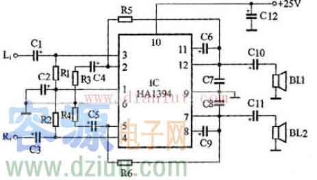 采用雙音頻功放集成電路HA1394,③腳和④腳分別為左、右聲道信號輸入端,12腳和7腳分別為左、右聲道功放輸出端。 C1、C3分別為左、右聲道輸入耦合電容,C10、Cll分別為左、右聲道輸出耦合電容。電路電壓增益為