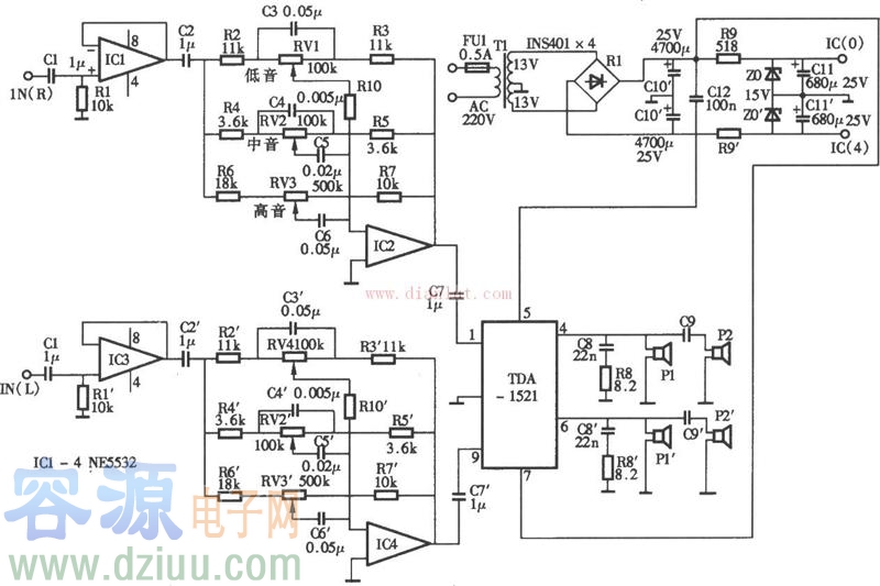 該20W+20W立體聲放大器由兩個完整而分立的20W RNS橋式放大器組成。輸入信號經過R1、R2和P1(電位器)構成的分壓網絡送入放大器。R1是信號源與地之間的負載阻抗,R2信號耦合到電位器P1。該信號由電容器C1到C2。