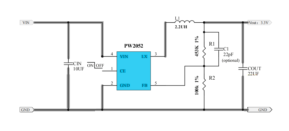 PW5200A工作頻率為1.4MHZ。輕載時自動PWM/PFM模式切換,提高效率。