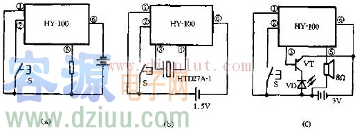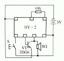 HY-2音樂集成電路內存三首樂曲,每對電路觸發(fā)一次,輸出的音樂信號也改變一次。當觸發(fā)端與觸發(fā)電平相連時,電路將反復鳴奏內存的三首樂曲,直到去除觸發(fā)電平為止。HY-2音樂集成電路的典型應用電路如圖所示。 :