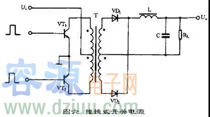 推挽式開關(guān)電源的典型電路如圖六所示。它屬于雙端式變換電路,高頻變壓器的磁芯工作在磁滯回線的兩側(cè)。電路使用兩個(gè)開關(guān)管VT1和VT2,兩個(gè)開關(guān)管在外激勵(lì)方波信號(hào)的控制下交替的導(dǎo)通與截止,在變壓器T次級(jí)統(tǒng)組得到方波電壓,經(jīng)整流濾波變?yōu)樗枰闹绷麟妷骸?/p>