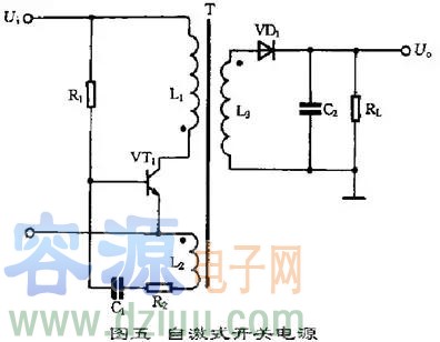 自激式開關(guān)穩(wěn)壓電源的典型電路如圖五所示。這是一種利用間歇振蕩電路組成的開關(guān)電源,也是目前廣泛使用的基本電源之一。