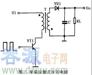 單端反激式開關(guān)電源使用的開關(guān)管VT1承受的最大反向電壓是電路工作電壓值的兩倍,工作頻率在20-200kHz之間。