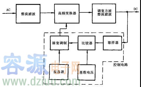 調(diào)寬式開關(guān)穩(wěn)壓電源的基本原理可參見下圖。