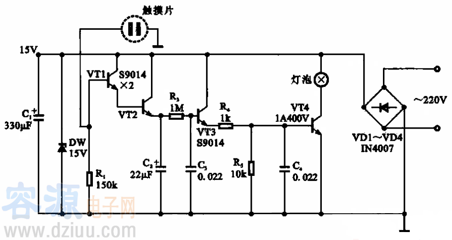 所示為觸摸延時開關電源電路。手觸動觸摸片時,相當于給VT1基極一個觸發信號使之導通,于是VI2也導通,電源經VT2給電容器cz充電,當充電電壓足夠高時,VT2截止,VT3導通,VT4也隨之導通,燈泡發光、照明。當C2上的電荷慢慢放掉后vr3截止。VT4也截止使燈泡熄滅。