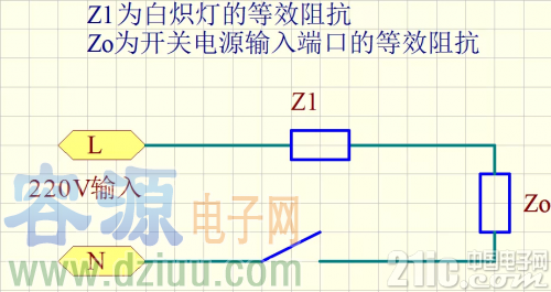 一個(gè)十幾瓦或幾十瓦的白熾燈的冷態(tài)阻抗大約在幾十歐姆到幾百歐姆,在此我假設(shè)為Z1=100Ω,根據(jù)阻抗的分壓比可知,白熾燈上的壓降是比較大的。