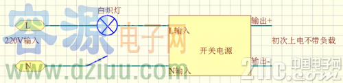 方法很簡單,就是在開關(guān)電源輸入線上串聯(lián)一個(gè)白熾燈來做保護(hù),如下圖。
