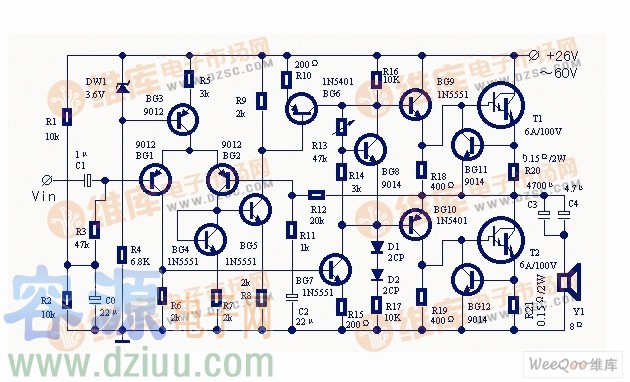 使用大功率達(dá)林頓管的實(shí)用功率放大器電路 :