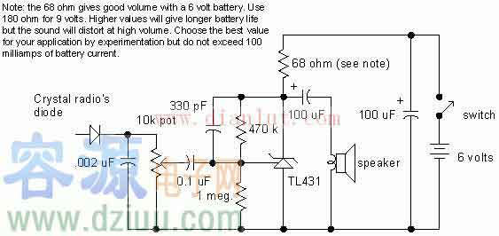 使用TL431分流穩(wěn)壓器設(shè)計(jì)的音頻放大器。該放大器可提供房間內(nèi)的水晶,從一個普通的一個長線天線和配備良好的地面收音機(jī)的音量。在復(fù)雜的電路是類似于一個簡單的晶體管收音機(jī),但其性能遠(yuǎn)遠(yuǎn)優(yōu)越。TL431的是在一個