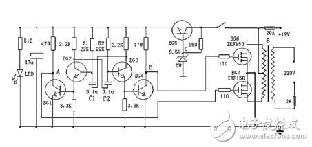 下圖較為容易制造的逆變器電路圖,能夠?qū)?2V直流電源電壓逆變?yōu)?20V市電電壓,電路由BG2和BG3組成的多諧振蕩器推進(jìn),再經(jīng)過(guò)BG1和BG4驅(qū)動(dòng),來(lái)控制BG6和BG7工作。其中振蕩電路由BG5與DW組的穩(wěn)壓電源供電,這樣能夠使輸出頻率比擬穩(wěn)定。在制造時(shí),變壓器可選有常用雙12V輸出的市電變壓器。可依據(jù)需求,選擇恰當(dāng)?shù)?2V蓄電池容量。