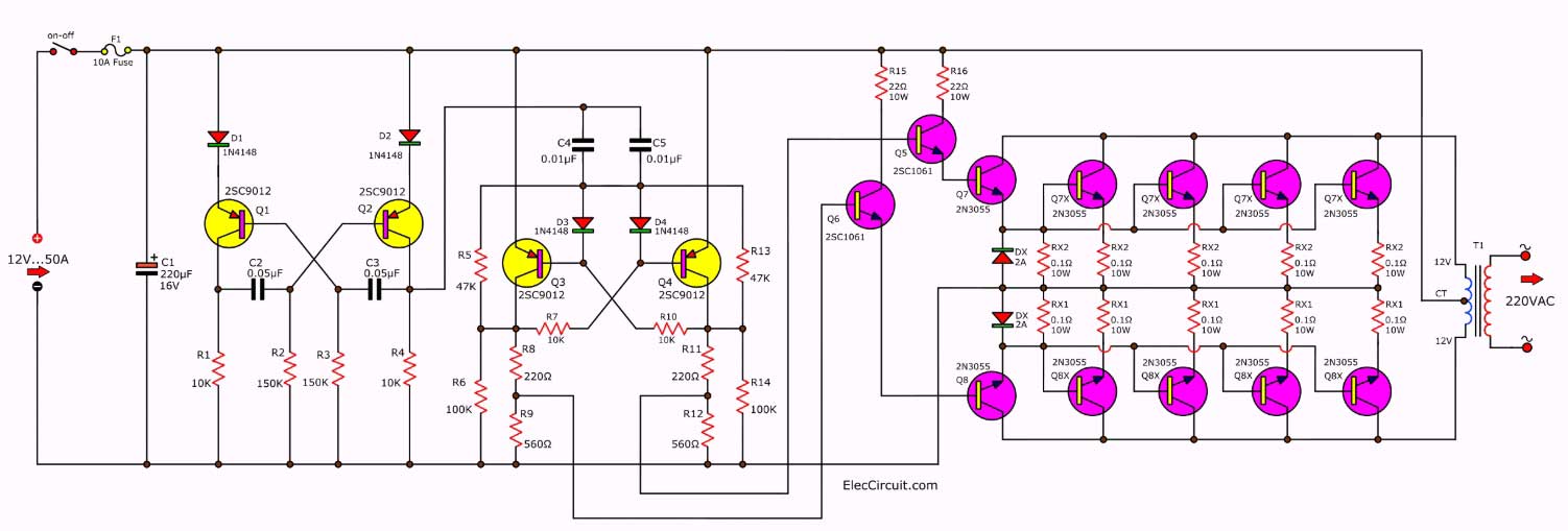 這是一個簡單的電路。按照相同的原理,我以12V的電池電壓產生一個約100 Hz的振蕩器,并傳遞給只有50HZ的兩個分頻器電路。并用10 x 2N3055晶體管并聯驅動一個10安培的變壓器。由一個具有2A的晶體管組成,當我使用10個晶體管或5對驅動器輸出大電流時。