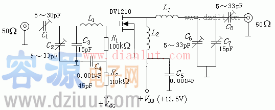 本電路是175MHz VMOS場效晶體管諧振功放電路,該電路功率增益10dB,效率大于60%,可向負載提供10W功率。 柵極采用并饋,漏極采用串饋。 柵極采用C1、C2、C3、L1組成的T形匹配網(wǎng)絡。 漏極采用L2、L3、C