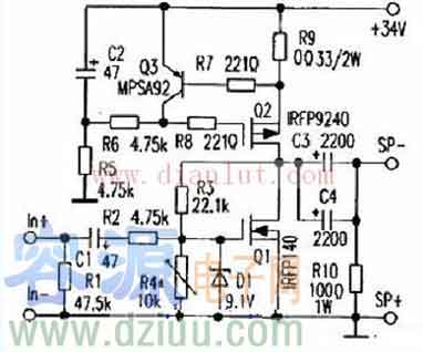 一臺既吸收電子管的“樂感”優(yōu)勢,又具有晶體管使用方便特點的晶體機,全機主角為Q1N-MOSFETIRFP140,由于是接成單級的增益放大,故為反相輸出,輸出端是喇叭的負端,而接地點才是正端。另外有一顆P-MOSFETQ2