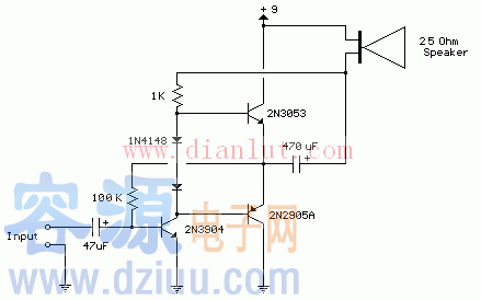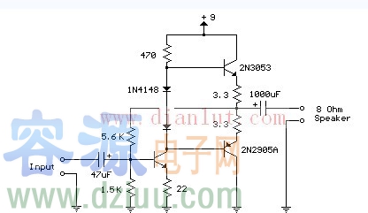 本電路是一個小的音頻放大器類似于一個小的晶體管收音機。輸入級可偏置電壓,使供應分在兩個互補輸出是略微偏導基地之間的二極管三極管平分。 3.3歐姆的電阻串聯(lián)使用,輸出晶體管的發(fā)射極穩(wěn)定的偏置電流,因此不