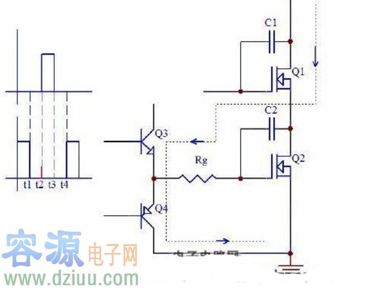 高頻逆變器后級電路圖一: 中C1,C2分別是Q1,Q2的GD結電容,左邊上下兩個波形分別是Q1,Q2的柵極驅動波形。我們先從t1-t2死區時刻開始分析,從圖中可以看出這段時間為死區時間,也
