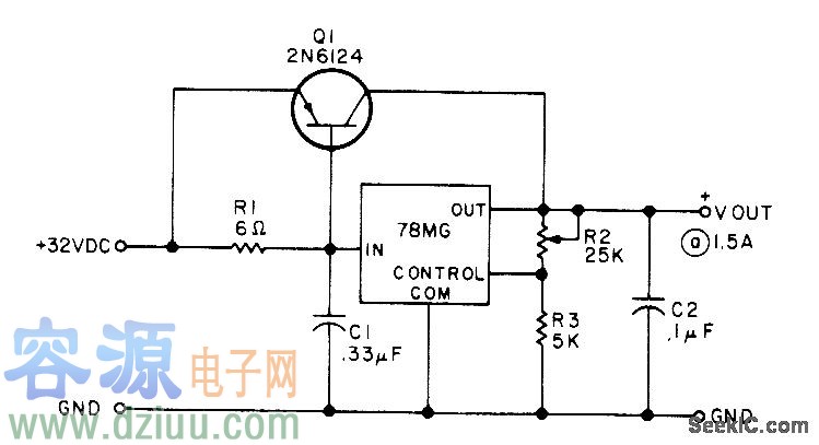 外部串聯旁路晶體管將500mA的78MG或79MG額定輸出提高到1.5A,以適用于實驗室可調電源。該電路的外部旁路晶體管無短路保護,但文章介紹了怎樣添加具有保護作用的晶體管來避免短路。 :