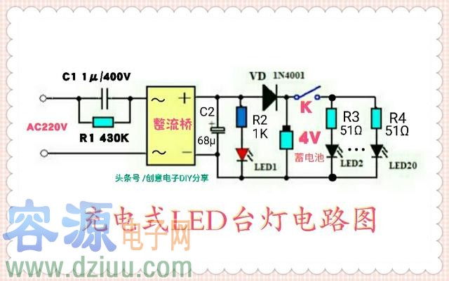 現在不少廉價的充電式LED臺燈都采用4V的小蓄電池作電源,簡單的阻容降壓電路充電,電路的故障率較高。本文詳細介紹一下這種充電式LED臺燈電路的工作原理,以方便大家維修時
