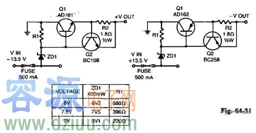 低電壓調(diào)節(jié)器短路保護電路,可提供6,7.5,和9 V從13.5 V標稱值,然而,他們將功能一樣好,如果連接到一個平滑的直流輸出變壓器/整流電路的汽車電池供電。 兩種類型的正反兩方面的地面系