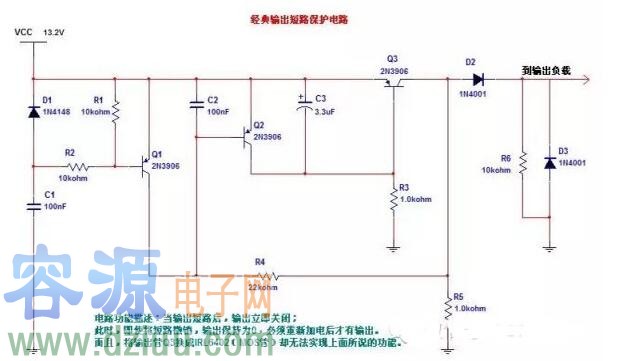 今天做了一個關(guān)于電機短路保護的電路,參考了經(jīng)典電路: 這是一個自鎖的保護電路,短路時:Q3極被拉低,Q2導通,形成自鎖,迫使Q3截止,Q3截至后面負載沒有電壓,這時有