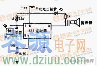 由555組成的感光式振蕩電路 如圖為由555組成的感光式振蕩電路。該電路用于探測(cè)閃電,可供盲人用作光雷達(dá)和報(bào)曉器等。555定時(shí)器的振蕩頻率隨光強(qiáng)度的增加而成正比例增加。當(dāng)它工作在自由振