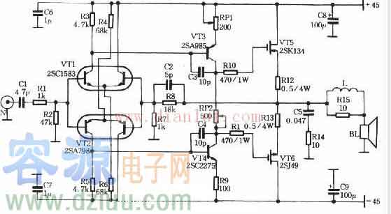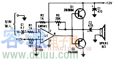 該電路是一個以LM741型運算放大器為基礎構成的倒相放大器,用于驅動晶體管互補對Q1和Q2.運算放大器的反饋回路包括兩個晶體管的基極-發射極結。這種電路配置有助于減小失真。通宵發射極-基極結的電壓降低大約0.6