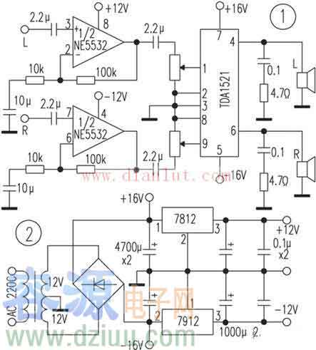 一、功放 功放部分采用高保真集成塊TDA1521,該集成電路外圍電路極其簡潔,而且還有過熱、靜噪、短路等保護電路,適合初學者自制。前級采用NE5532(是一種雙運放高性能低噪聲運算放大器,它顯示