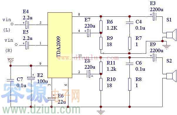 TDA2009是常見的高保真功放集成塊。額定功率為2×10W.電源電壓為8~28V。最大輸出電流為3.5A。具有過熱保護電路。(2×10W,THD=0.5%) 本電路采用該TDA2009所做的幾套功放來看,效果還是很不錯的,本電路地線