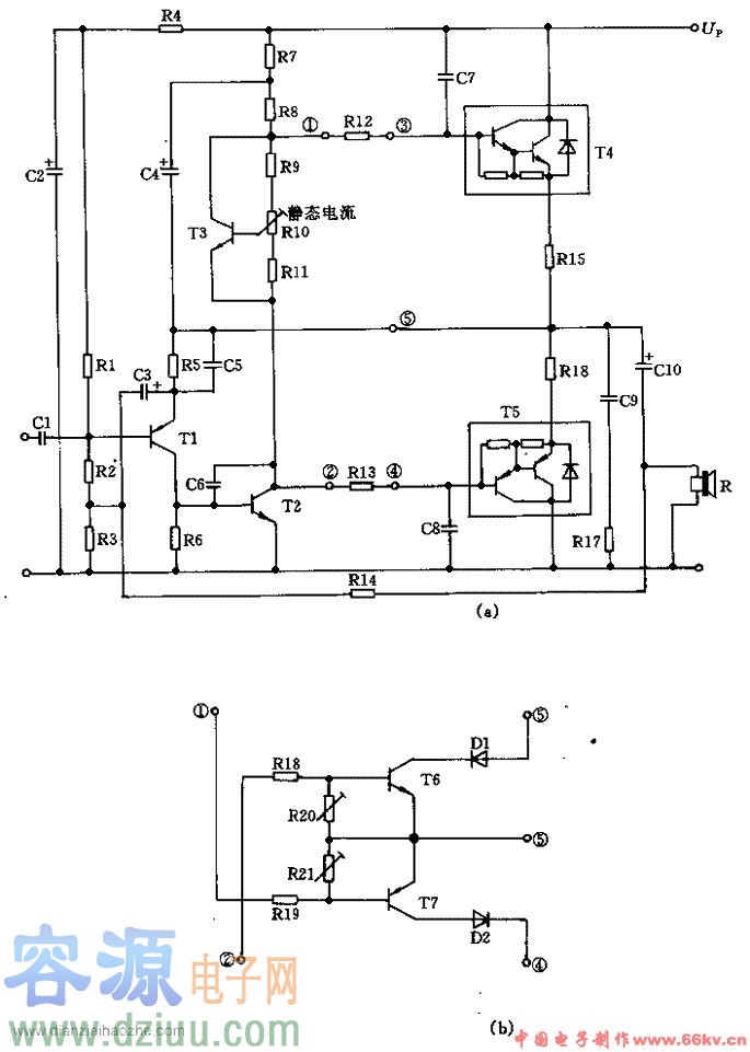 本電路全部采用分離元件制作,各元件取不同值可分別適應25W、50W和100W的功率輸出。 如果將圖(a)中①~⑤各點間的電路用圖(b)電路部分代替,則可防止在控制信號過大或輸出短路時末級晶體管過載。當超過由R20