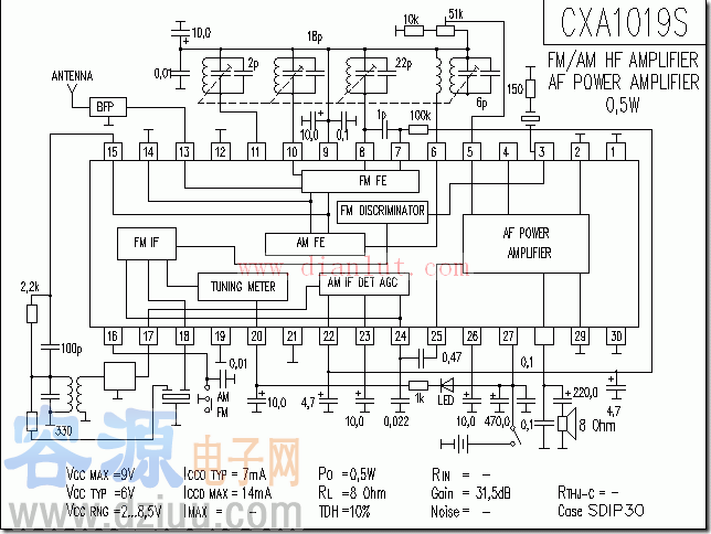 CXA1019S收音機電路圖及引腳功能、電路參數