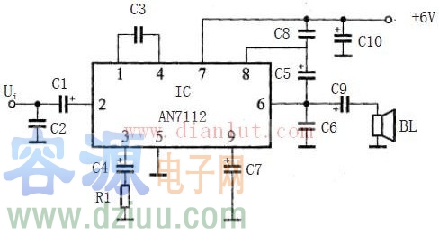 如圖所示,為0.5W單聲道OTL放大電路! C采用了OTL音頻功放集成電路AN7112.AN7112為單列9腳式封裝,②腳為音頻信號輸入端,⑥腳為功率信號輸出端,閉環電壓增益為50dB,滿功率輸出時輸入信號Ui=6mV,采用+6V單