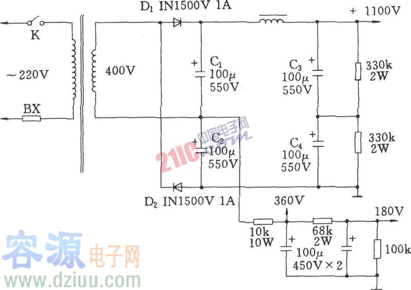 如圖所示為用于電子管功放的高壓倍壓電路,1100V高壓可供給211、811、845等高屏壓功放管使用。 :