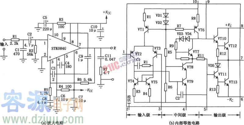 輸入級是由VT4和VT5構成的電流鏡像電路,把差動輸出變換為單端輸出,同時獲得較大增益。中間級可處理較大振幅,決定轉換速率,其工作電流應盡量大,采用VT8基極接地方式以減少密勒效應對高頻特性的影響。VT7用于