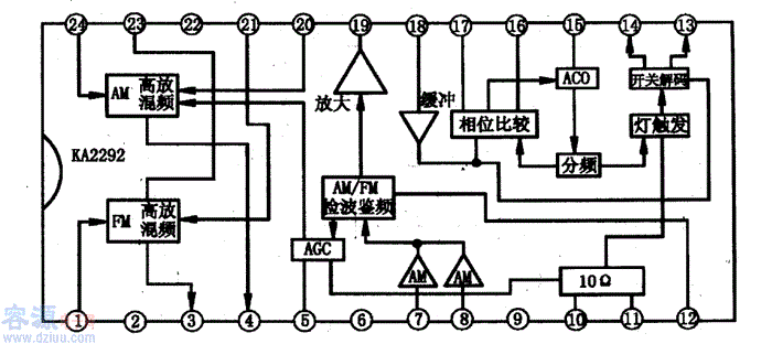 KA2292是韓國(guó)三星(SAMSUNG)公司近年來(lái)推出的新穎單片音響集成電路,內(nèi)含調(diào)頻立體聲解碼電路,應(yīng)用在音響電路中,主要是用來(lái)完成AM/FM多波段收音功能。 1、KA2292主要功能 KA2292集成電路的調(diào)頻部分主要包