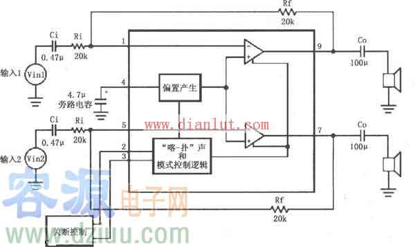 左聲道音頻信號(hào)輸入LM4912的1腳,經(jīng)過(guò)內(nèi)部放大器放大后由9腳輸出。而右聲道音頻信號(hào)輸入LM4912的5腳,經(jīng)過(guò)內(nèi)部放大器放大后由7腳輸出。最后經(jīng)過(guò)耦合電容Co加到各自聲道的揚(yáng)聲器上。放大器的最大功耗PDMAX=VDD2/