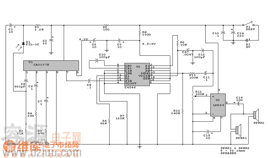 :LM386功放應用電路圖;本電路應用LM386作為功率放大IC,由CA3237E和C4046提供前級處理。