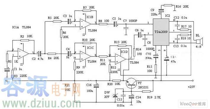 tda2009a由于采用專用集成電路,使得制作變得非常簡單,性能也不錯。 對于電子愛好者制作非常方便,從電路圖中可以看出,除了tda2009a外,其于都 是少量電子元器件,制作成功率很高,有興趣的朋友可以制作試試看效果。