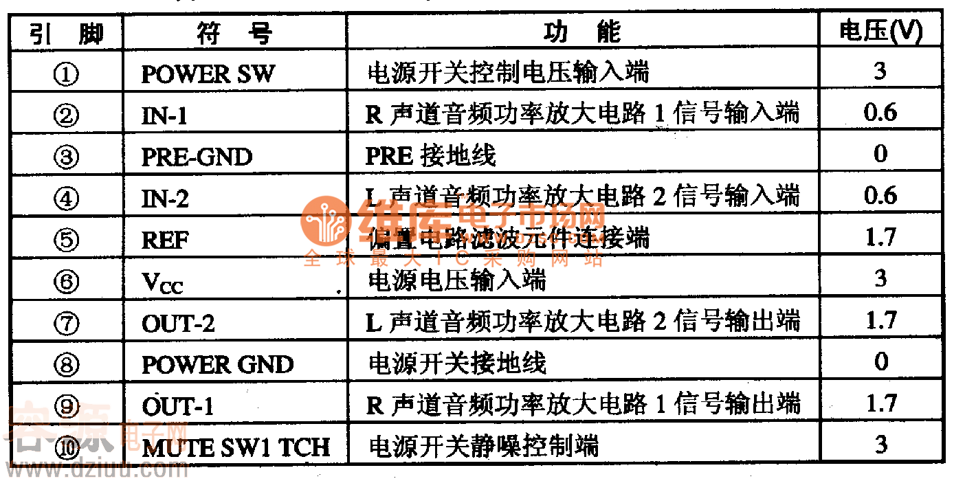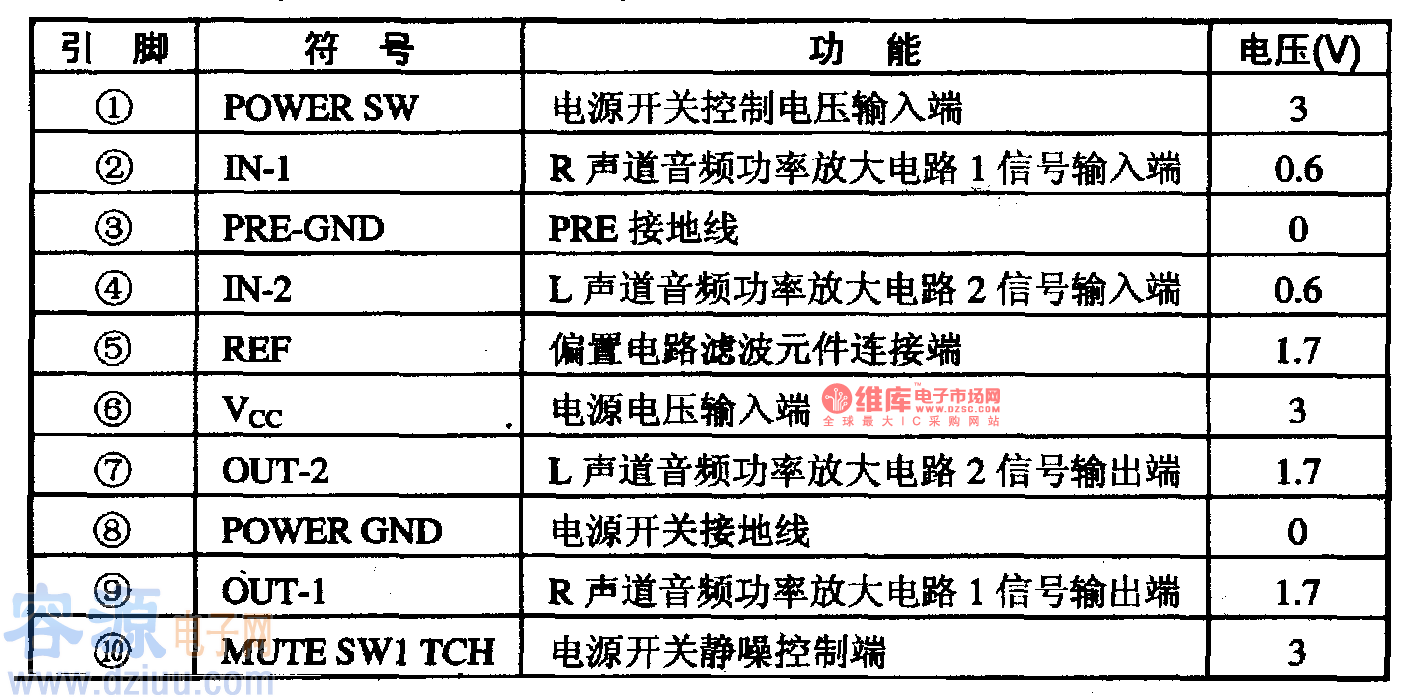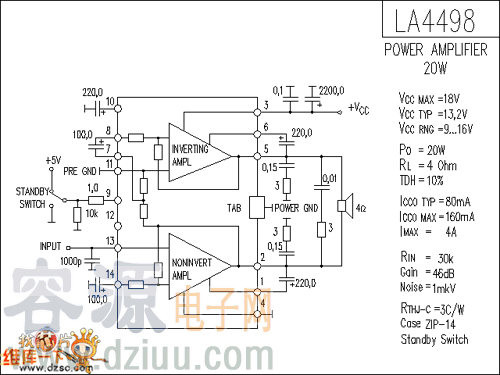 LA4500功放IC應用雙列20腳封裝;電源VCC=24V;允許功耗Pd=15W;輸出電流=2.5A;靜態(tài)電流=20mA;輸入電阻=30kΩ;輸出噪聲=0.4mV;電壓增益=48~52dB;諧波失真=0.3%~1.5%。