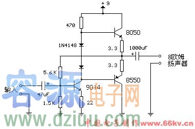 這里介紹一個設計小巧、線路簡單但性能不錯的三管音頻放大器。其電路見附圖。也許你在一些袖珍晶體管收音機可以看到一些與此類似的電路。 原理分析: 電路如圖所示,輸入極(9014)的基極工作電壓等于兩輸