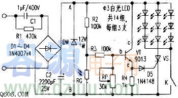 這是一款具有光控功能的LED照明燈,它白天不工作,晚上自動點亮。該燈共用42個高亮白光發光二極管,每3支串聯,然后再相互并聯后接于電源兩瑞,適用于樓梯、過道等作照明。 220V交流電經電容限流、橋式整流、