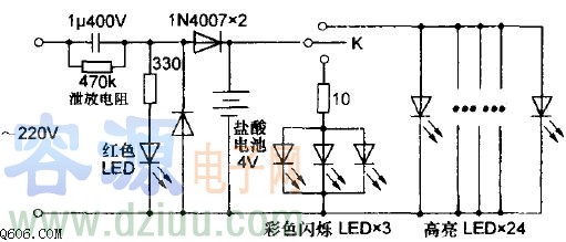 220V交流市電經電容降壓、二極管整流后給鉛酸蓄電池充電,紅色LED作充電指示。充好電后使用時閉合按鈕開關K,將首先接通3顆彩色閃爍LED,發出夢幻般變化莫測的七彩光芒,在夜間平添一些生活樂趣,再按一下開關K則關