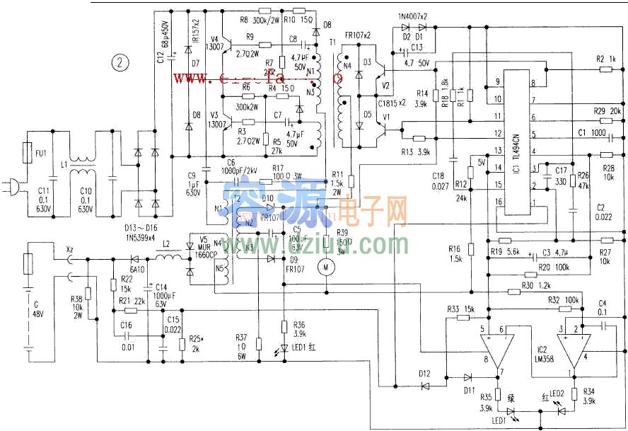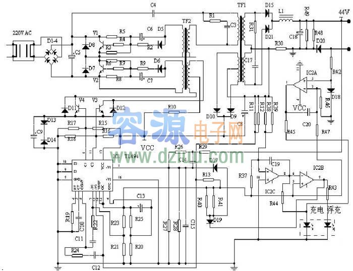 標(biāo)簽:充電器電路圖文中介紹兩款充電電路,都是48V充電電路,應(yīng)用LM494、LM358控制,電路圖如下: